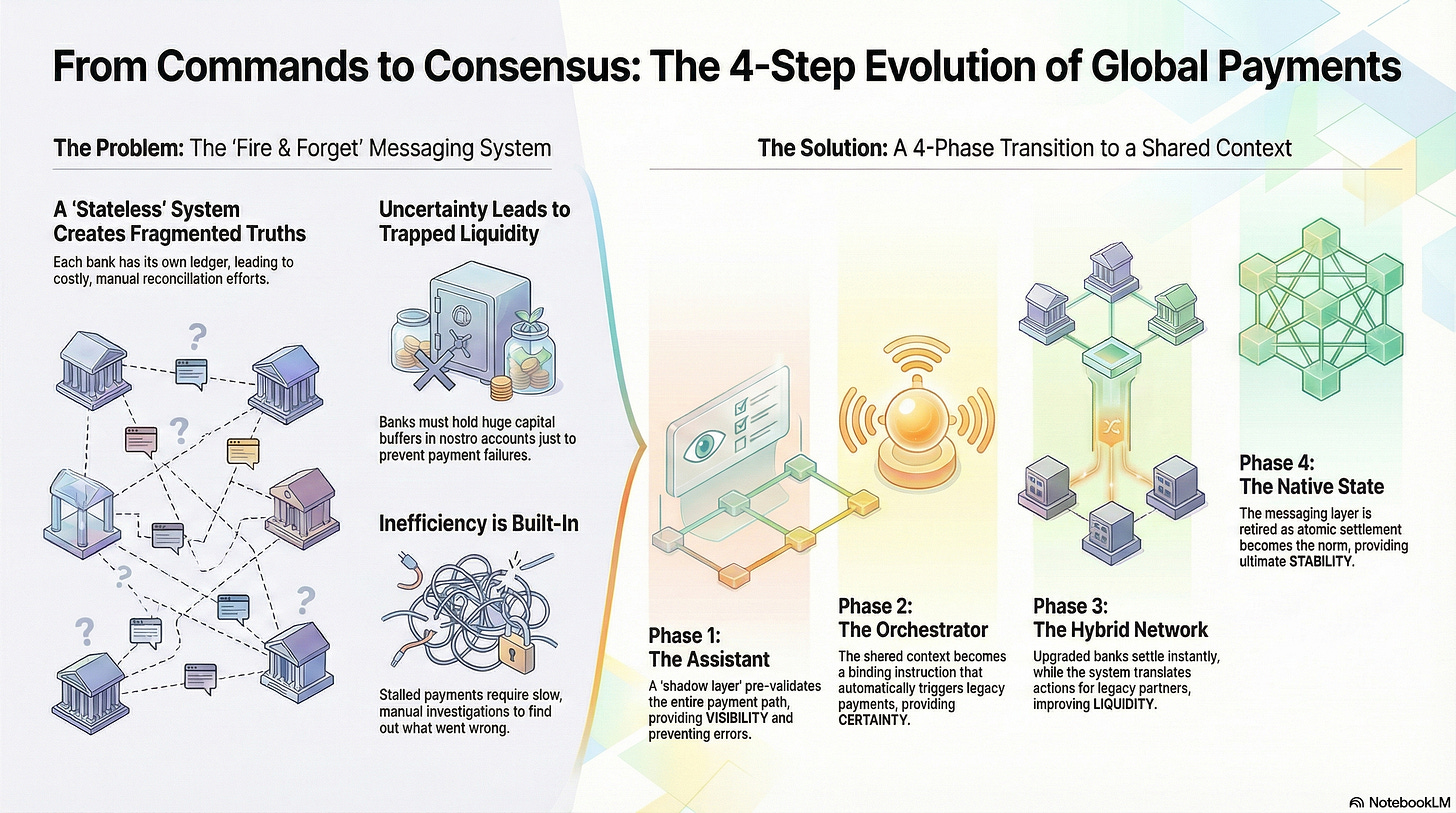 No More “Fire and Forget”: Bank A doesn’t need to “tell” Bank B that funds are coming via a formatted instruction. Bank B is already a participant in the Context; they observe the commitment of funds the moment it happens.