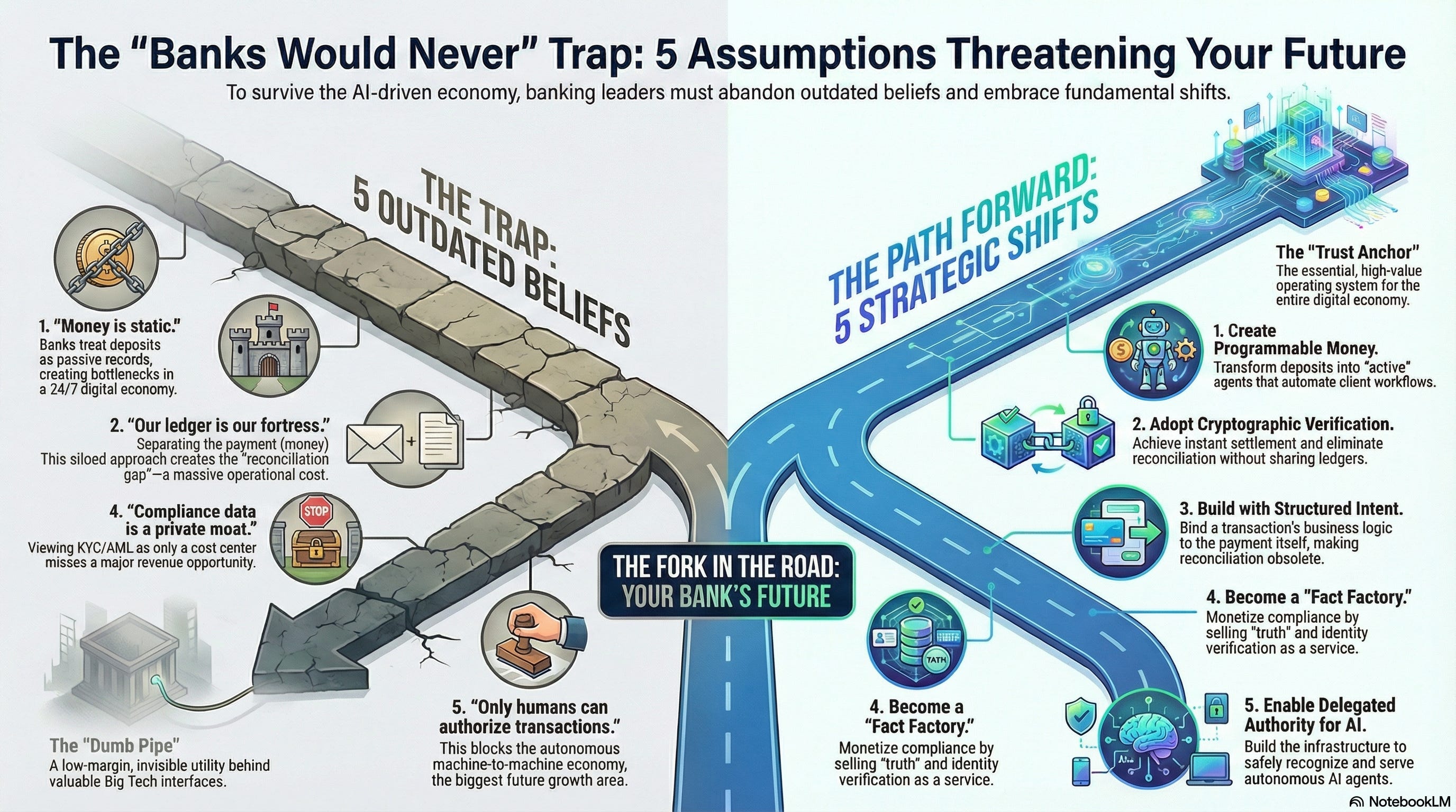 If banks continue to cling to their “nevers”—refusing to program money, refusing to share state, and refusing to verify AI agents—they will not disappear. Instead, they will become invisible.
